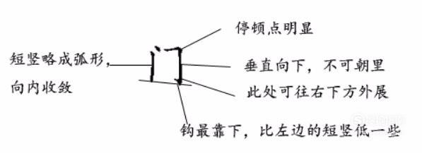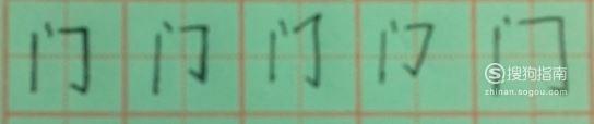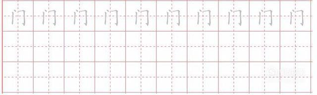 “门”字的写法要领:整个门字属于前面讲过的“日”型,左边的短竖、右边的横折钩,与日字基本是相同的:左边的短竖不是垂直向下,而是稍微往里收敛,右边的横折钩的折笔向下,不可向里,而且钩要最靠下。