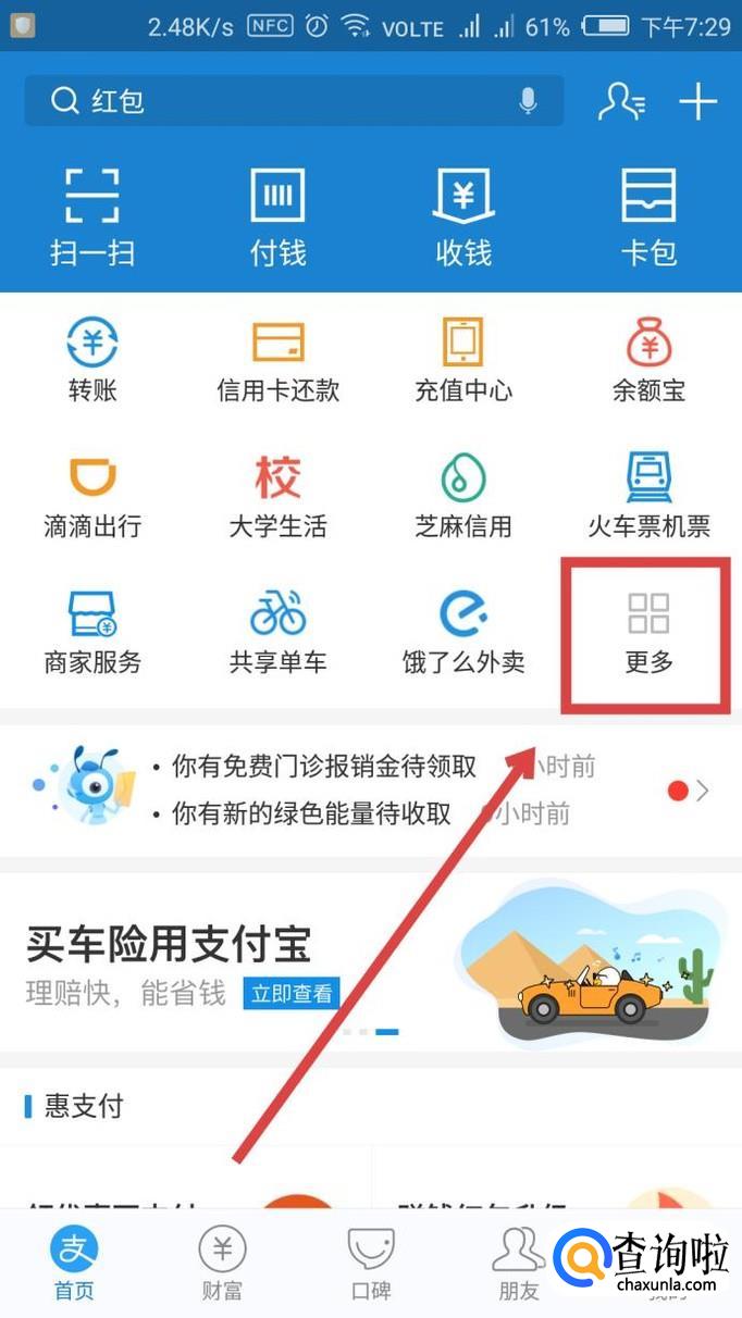 首先我们打开支付宝,在首页右侧找到【更多】,点击进入。