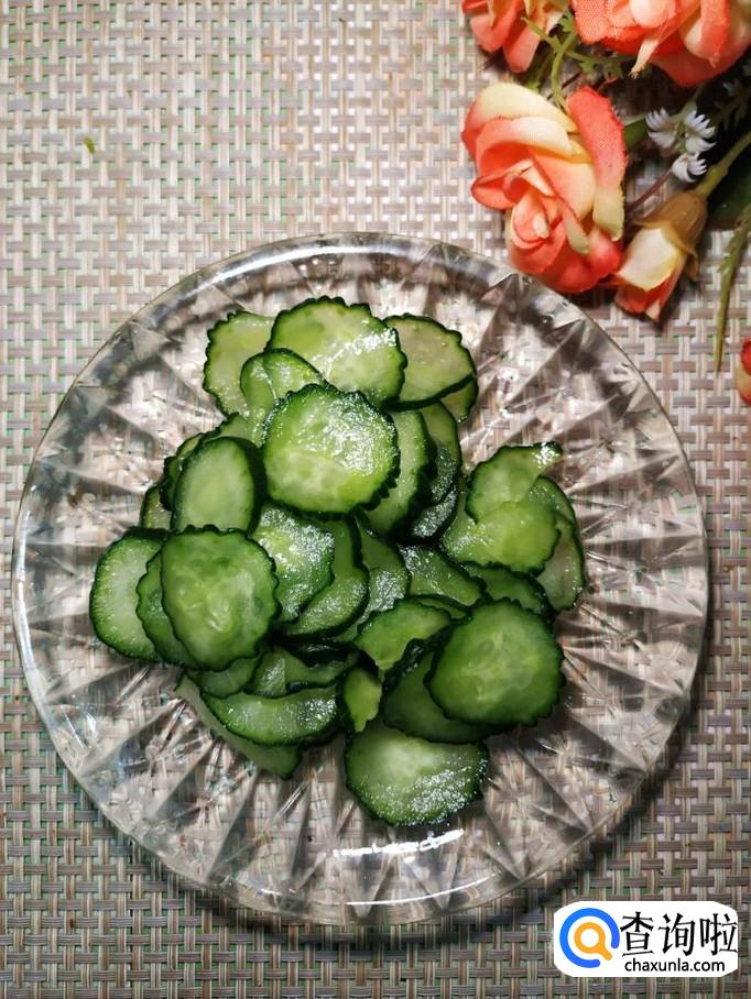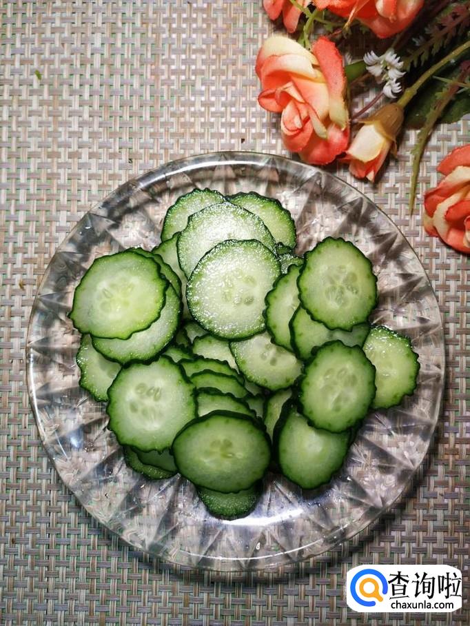 准备适量黄瓜,洗净后切成小圆片,看起来和铜钱大小差不多。放入适量盐,腌制十分钟左右,腌出水分。
