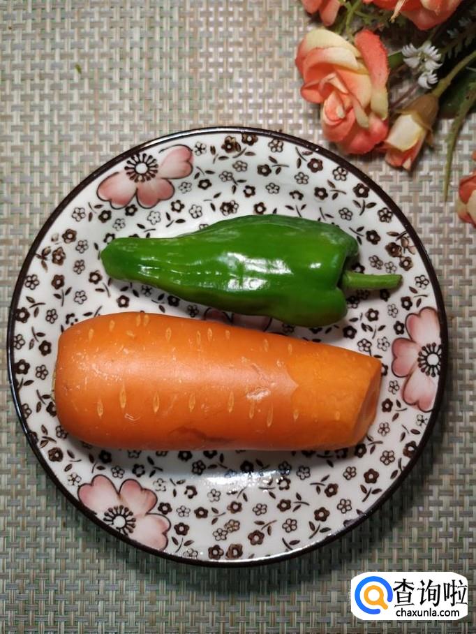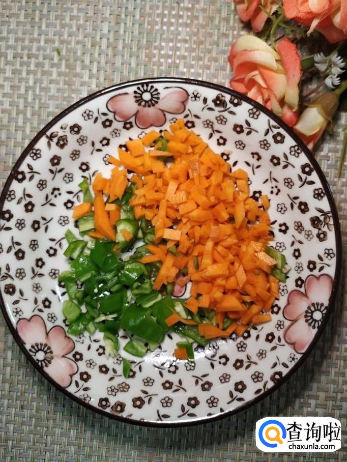 准备适量胡萝卜,洗净后,去皮切碎,再准备适量青椒,洗净后切成小丁儿,和胡萝卜放在一起备用。