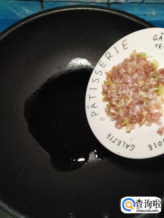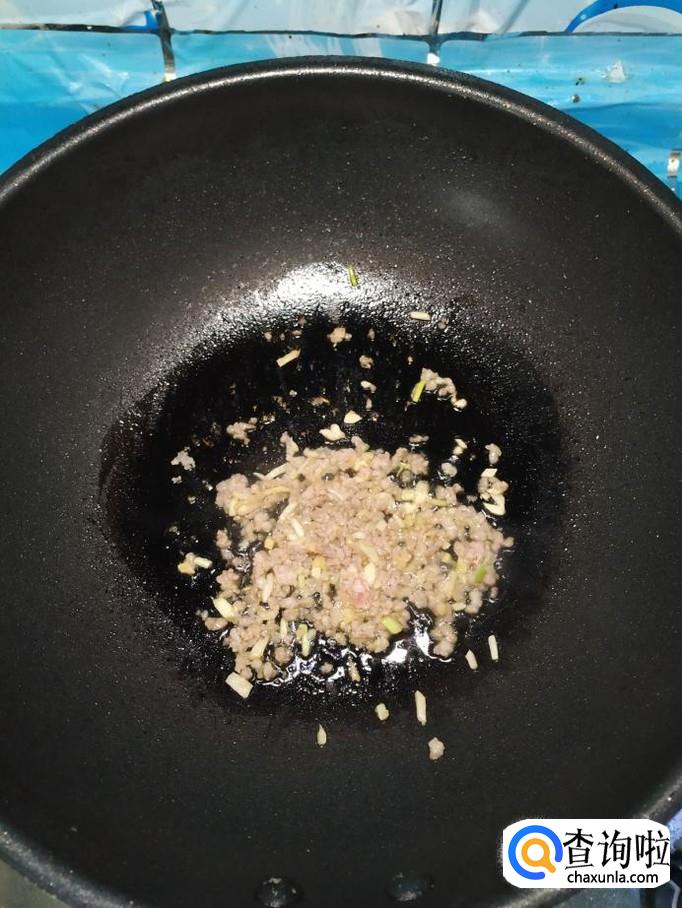 炒锅中放入适量油,油热后,将肉末倒入锅中炒香,肉末很容易熟,看到肉末变色就差不多了。