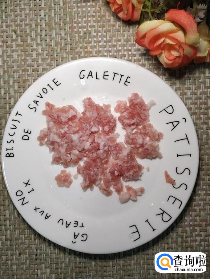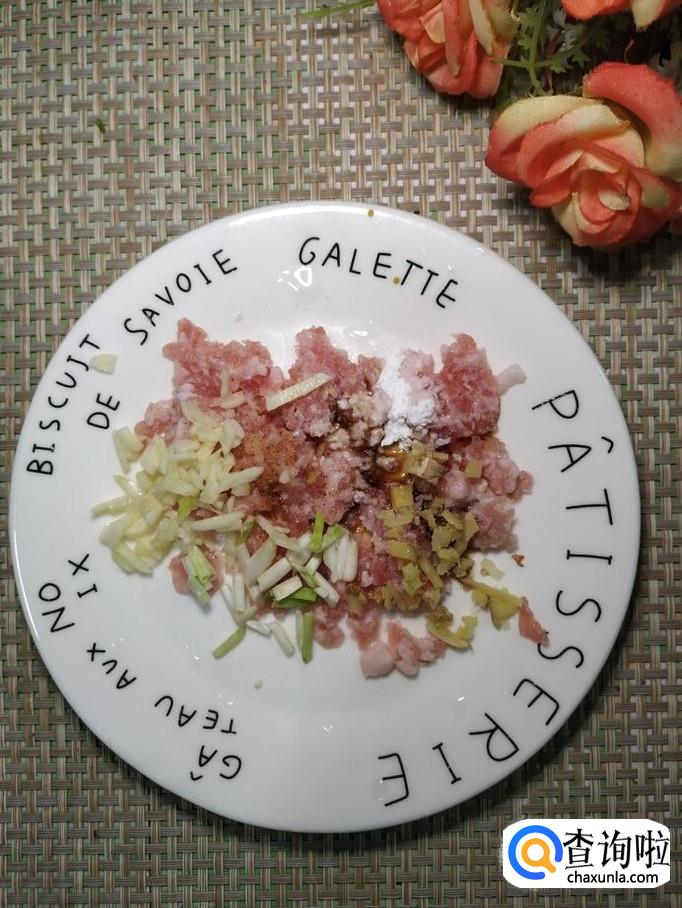 准备适量五花肉,洗净后,用刀剁碎,再准备适量生姜,洗净后切碎,放在上面,加入适量盐,鸡精,五香粉,生抽,料酒,淀粉,搅拌均匀,腌制十分钟。