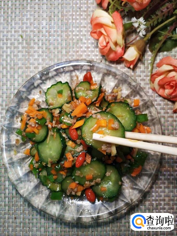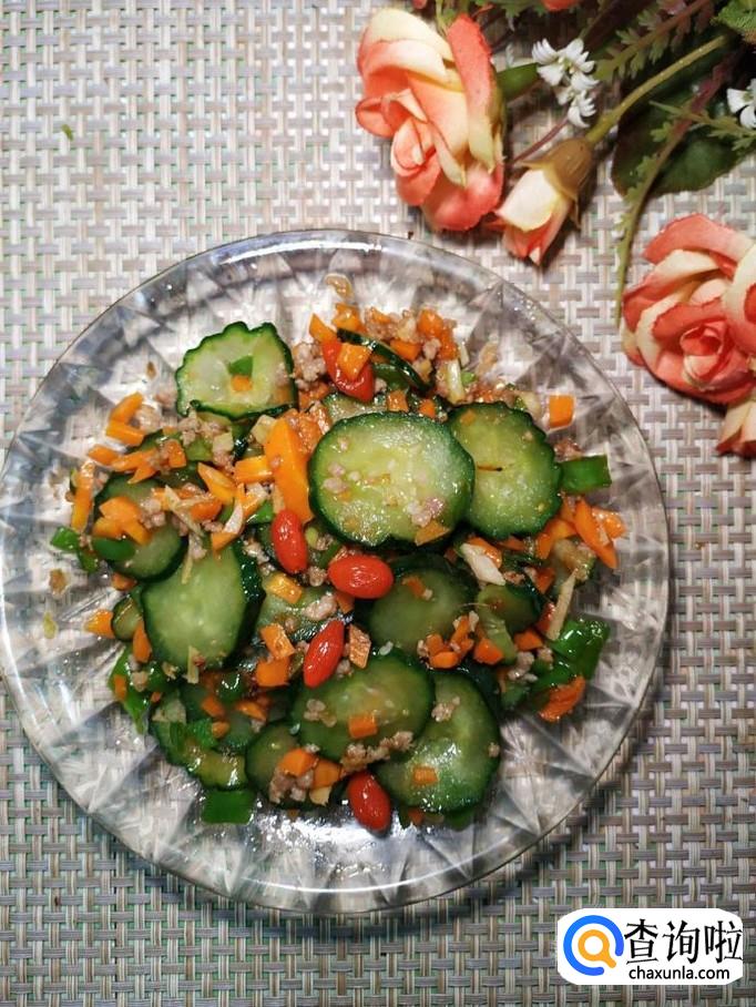 黄瓜适量,五花肉适量,胡萝卜适量,青椒适量,枸杞子适量,生姜适量,盐适量,鸡精适量,五香粉适量,生抽适量,陈醋适量,淀粉适量。