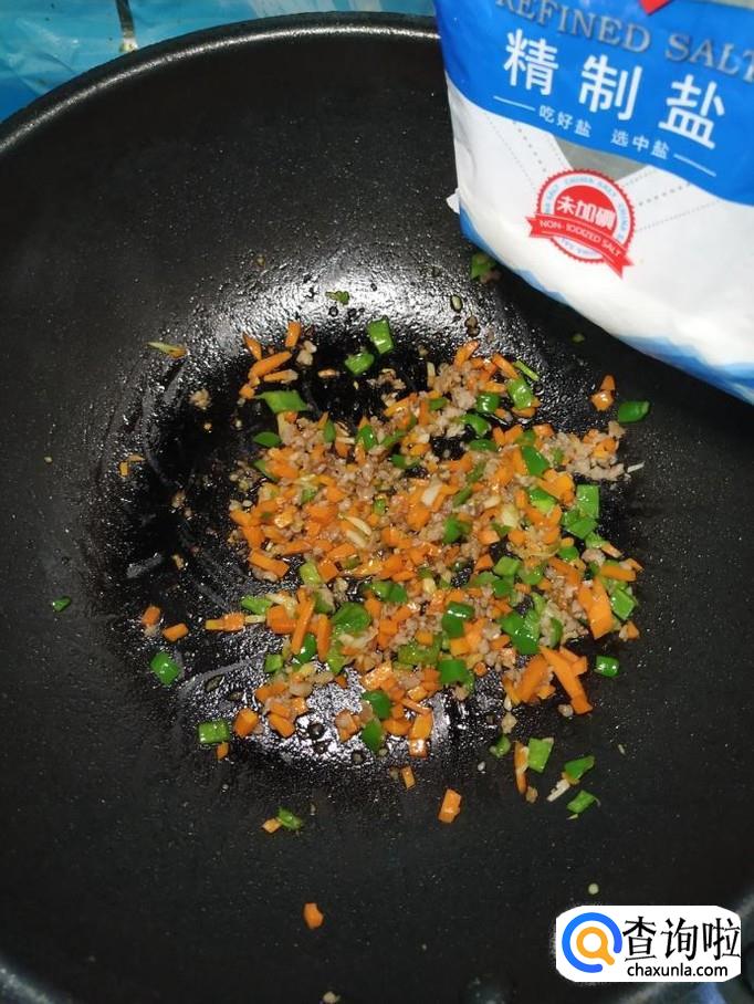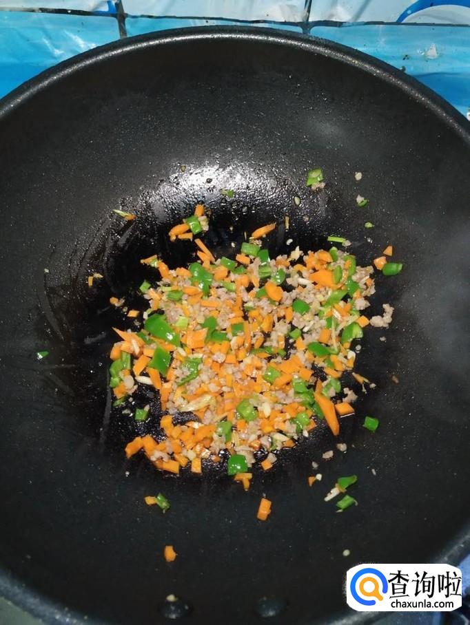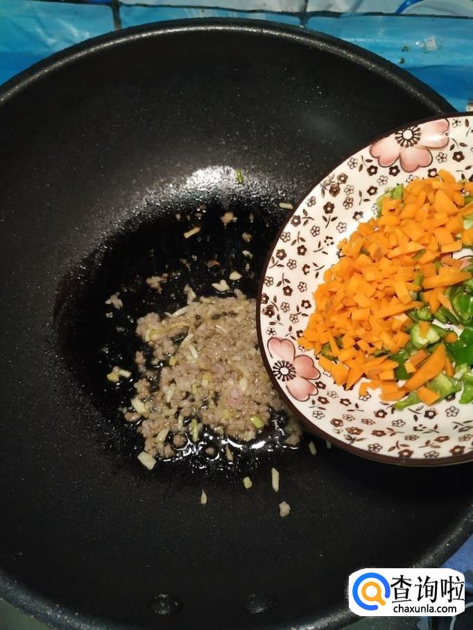 将准备好的胡萝卜丁和青椒丁倒入锅中,翻炒均匀。