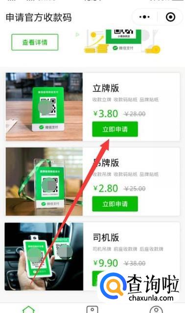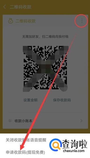 进入之后,点击图示位置,然后选择“申请收款码”,如图所示。