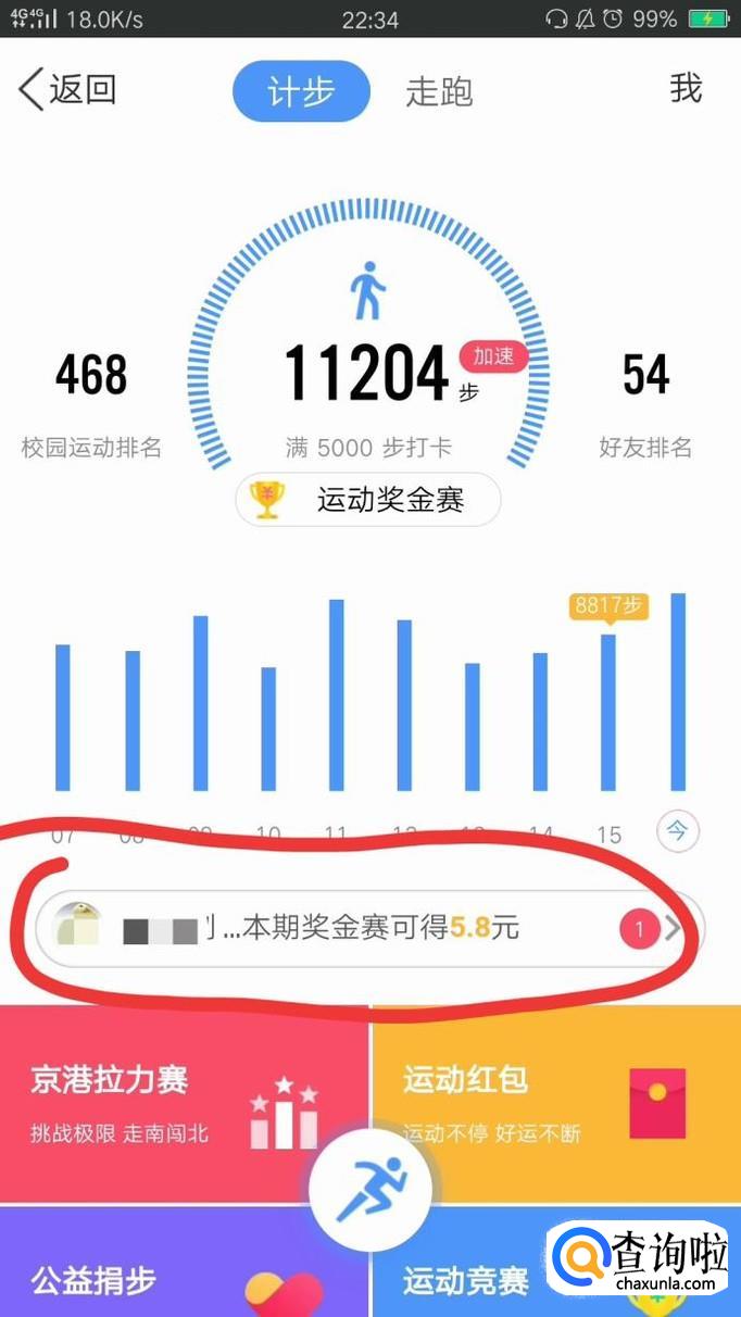 在运动界面,你可以看到自己今天走了多少路,也可以看到自己的好友得了多少奖金。我们点击红色圈圈中间的位置,好友得奖金的提示。