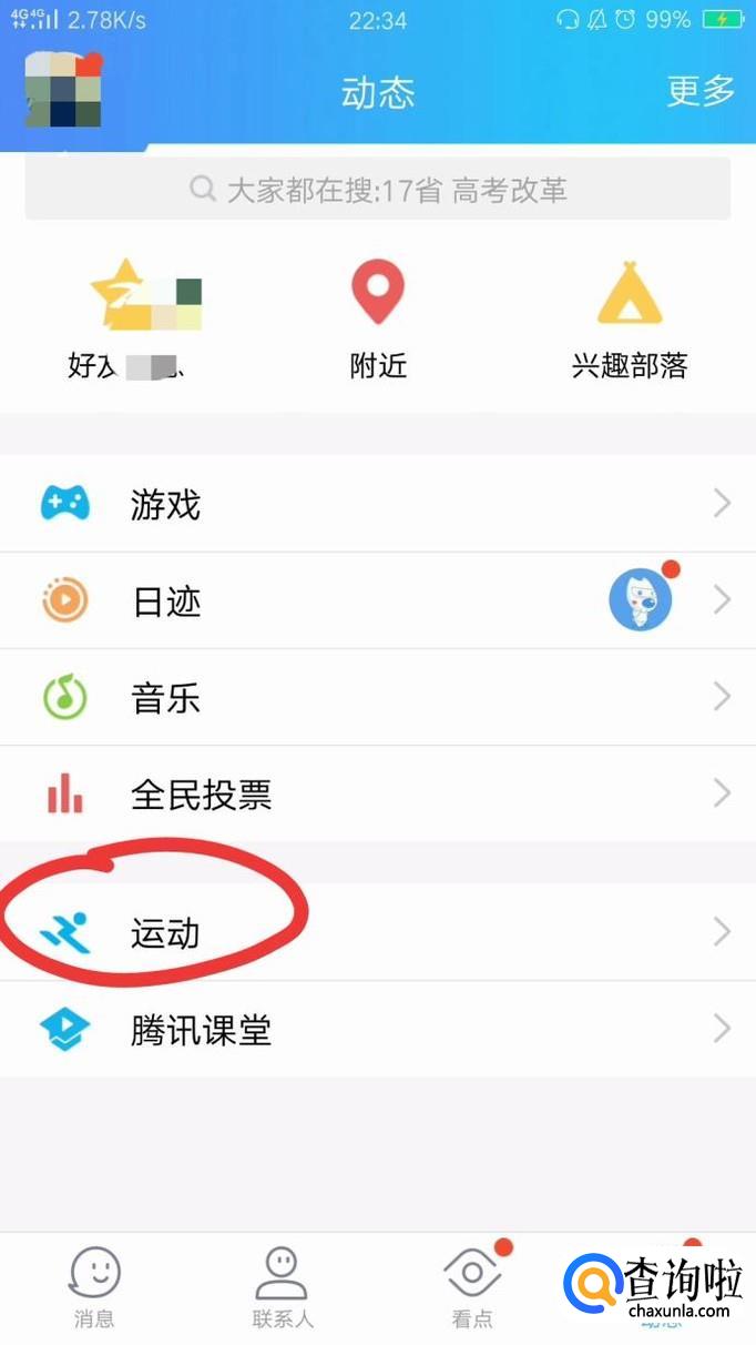 首先打开QQ,找到"运动",点开。