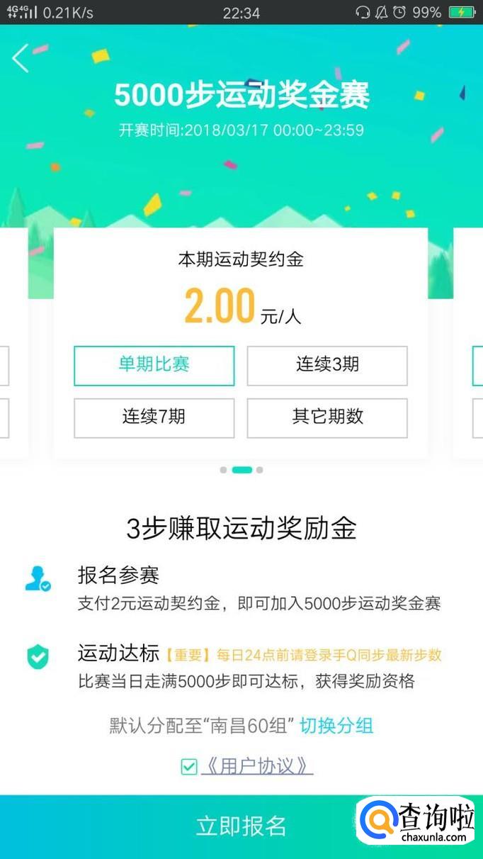 点击界面下方的"确认报名",付两块钱的契约金就可以开始比赛。开始比赛后,当你每天运动量足够多的时候就可以得到奖金了。
