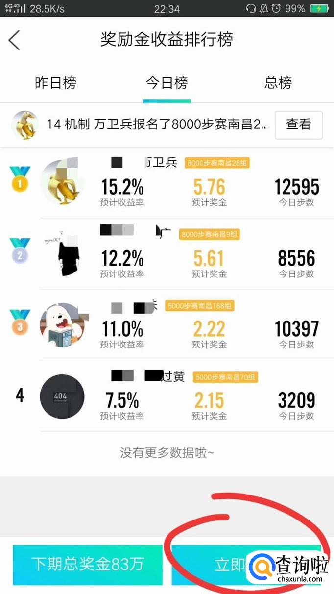 接着,我们便可以看到QQ好友的奖励金收益排行榜,点击界面右下角的"立即报名"。
