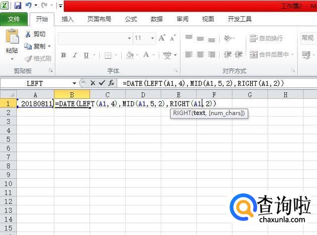 然后我们选中该单元格后面的单元格,输入:=DATE(LEFT(A1,4),MID(A1,5,2),RIGHT(A1,2));