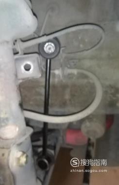 拆下轮胎后就可以看到平衡杆球头,连接着平衡杆和减震器上的就是了,用18号扳手就可以把螺母拆下,先把螺母松至跟螺丝持平,然后用榔头敲一下螺丝把球头敲松再把螺母取下就容易拿下球头了。上下两个球头都是这样拆下。