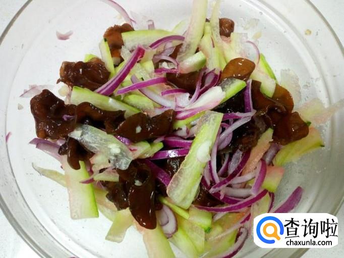 把控干水分的木耳,切好的西瓜皮,圆葱,蒜末一起放入碗中,放入一匙儿白糖,一匙儿醋,少许盐,少许味精,拌和均匀。