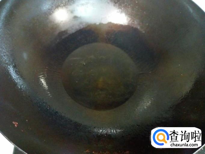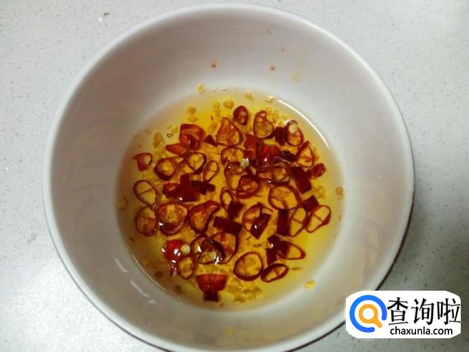 锅内放入油加热,油七,八成热时,关火。稍凉后,倒入切好的红干椒碗中,炸成辣椒油。