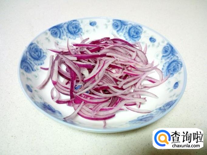 圆葱去皮,用水清洗干净,控干水分,切成丝。