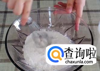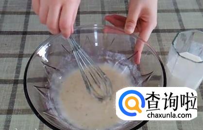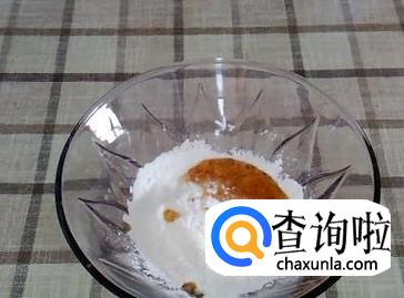 放入藕粉和糯米粉,加入2-3勺糖桂花,倒入适量的牛奶,将其搅拌均匀直到呈米糊状