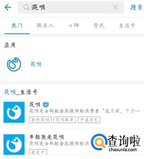 在支付宝的搜索窗口页面输入“花呗”两字进行搜索,点击后进入花呗。