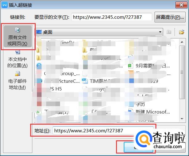 然后会弹出插入超链接界面,点击原有文件或网页然后在地址栏输入网址,并点击确定。