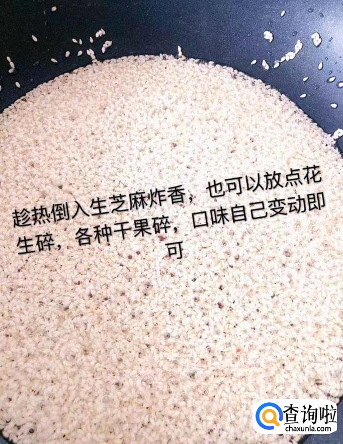 接着锅中放入适量的食用油,待油冒烟,倒入生芝麻翻炒两分钟,如下图所示。小贴士:大家也可以往里面放入花生碎和各种干果碎,具体加什么,大家可以根据自己的口味进行变动。