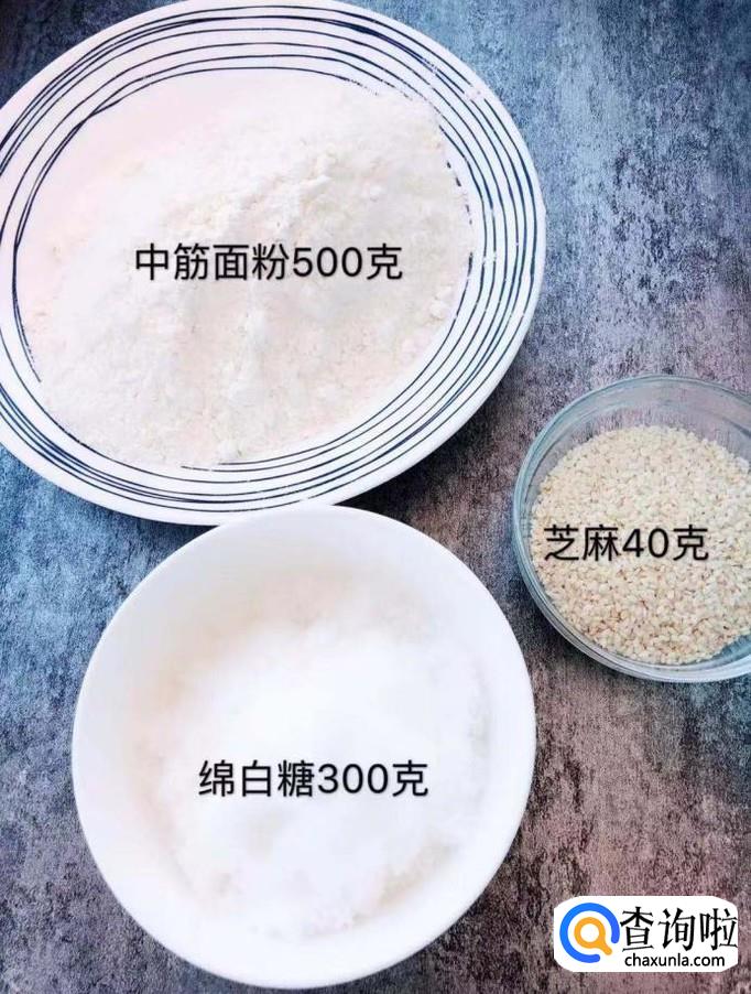 食材:中筋面粉500克,绵白糖300克,芝麻40克。