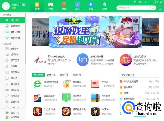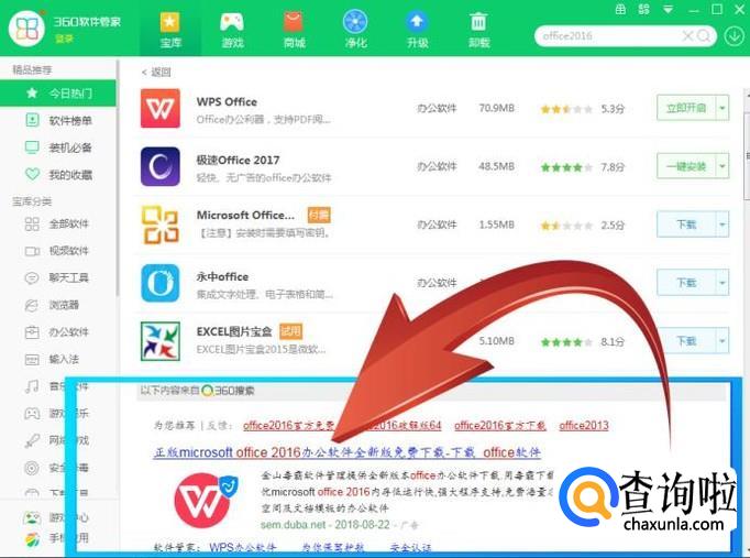 在360软件管家界面右上方搜索“office2016”,进入下一步,如下图。