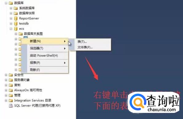 接下来右键单击表,选择新建下面的表选项,如下图所示