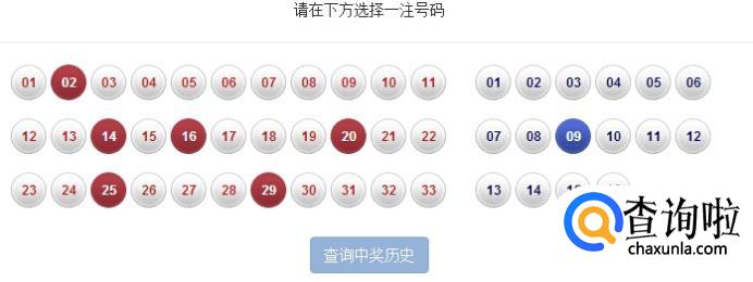 彩票就是7个号码组成,6个红色和1个蓝色。这时随便选择一组,以“02、14、16、20、25、29、09”为例。然后点击查询。