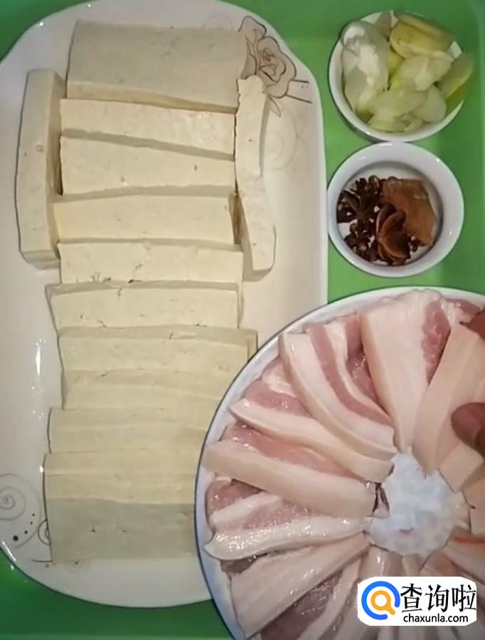 首先我们将豆腐与五花肉切成厚片备用,准备一些葱姜蒜,花椒大料,桂皮,香叶备用