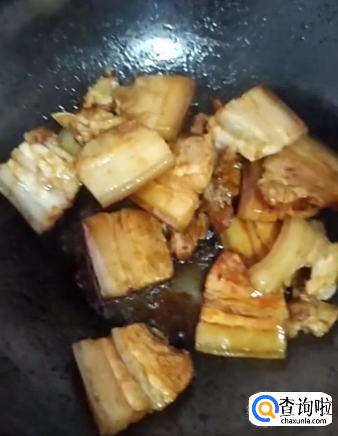 然后我们在锅中留少许底油,放入适量的白糖,开小火,熬至焦糖色,放入五花肉,翻炒一下