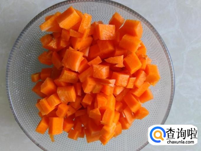 红萝卜去皮,然后切成小丁。