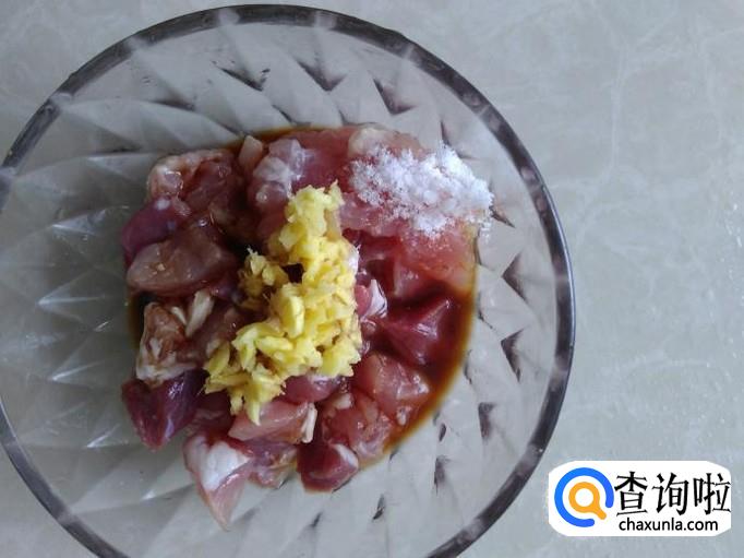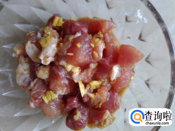 瘦肉切成小丁,加盐、姜蓉、生抽、料酒腌制几分钟。