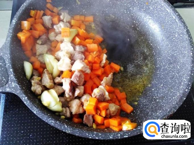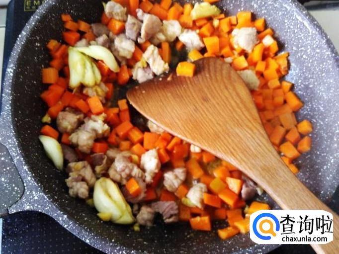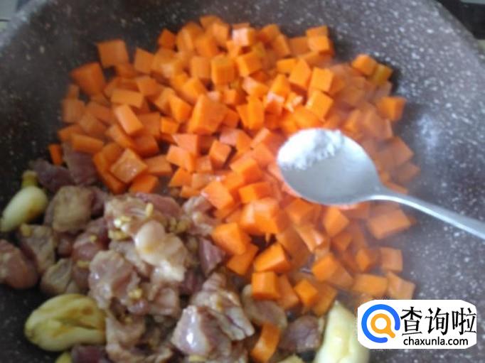 然后下红萝卜丁,加适量的盐翻炒一下。