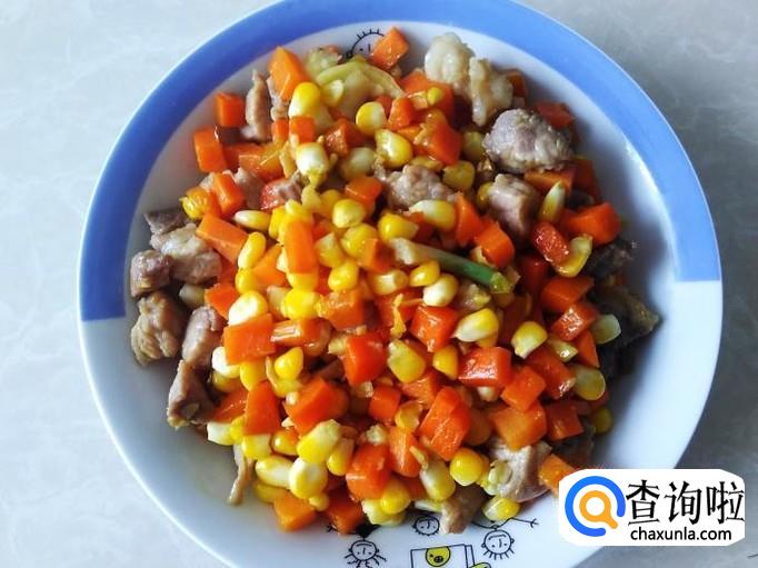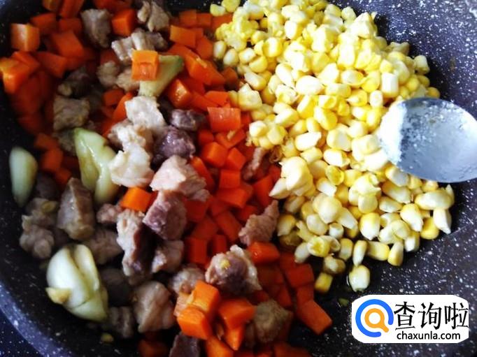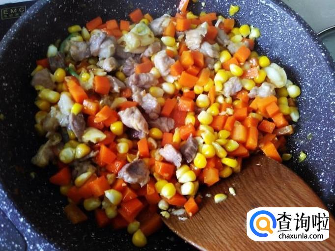 然后和肉丁、萝卜丁一起翻炒2分钟就可以了。【玉米很容易熟不要炒太长时间】