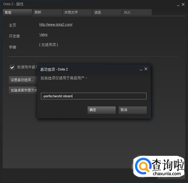 将DOTA2添加成功后,接着将DOTA2点击右键,在“属性”设置中更改属性启动选项,在对话框中填写“perfectworld”。