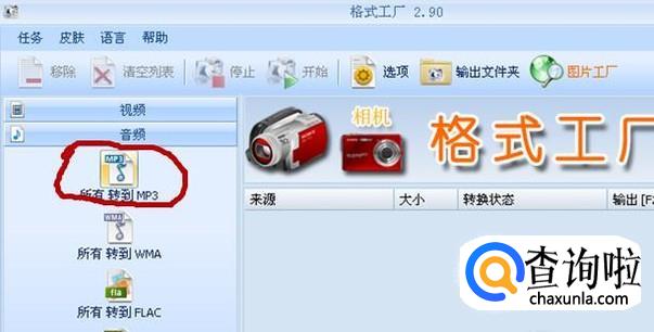 打开格式工厂,点击左边的“音频”,然后在下面点选“所有转换到MP3”。