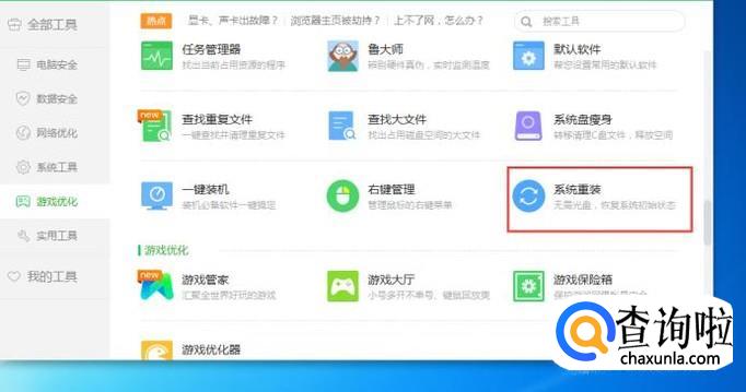 在我的工具界面点击下游戏优化功能会看到系统重装的功能,如图