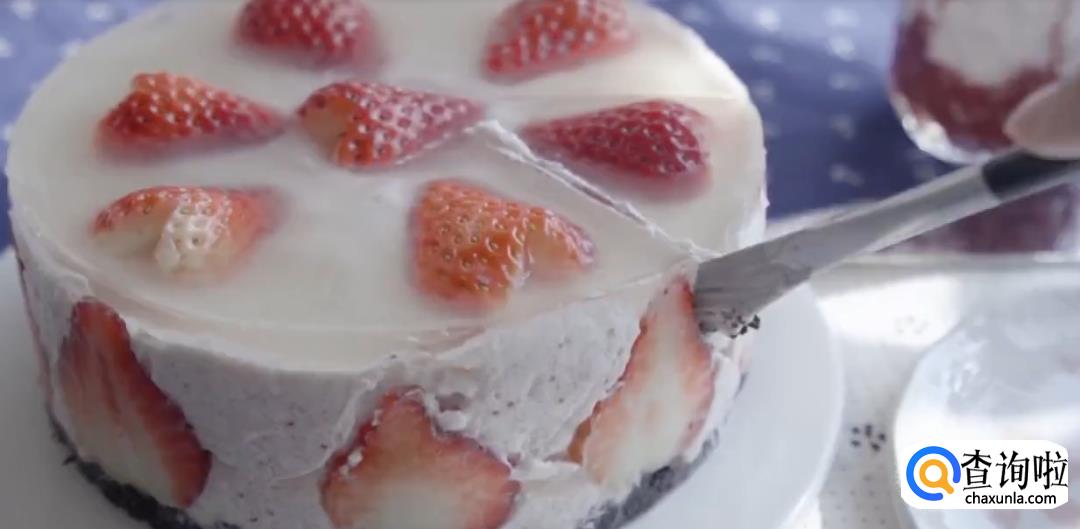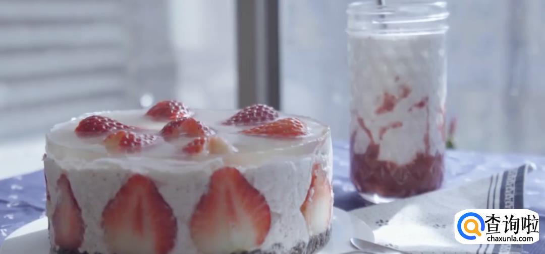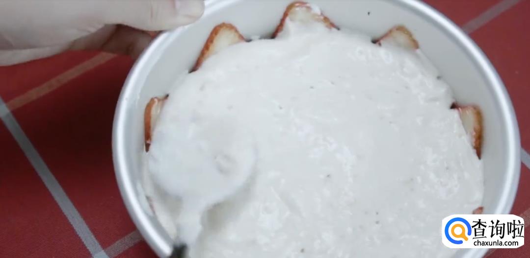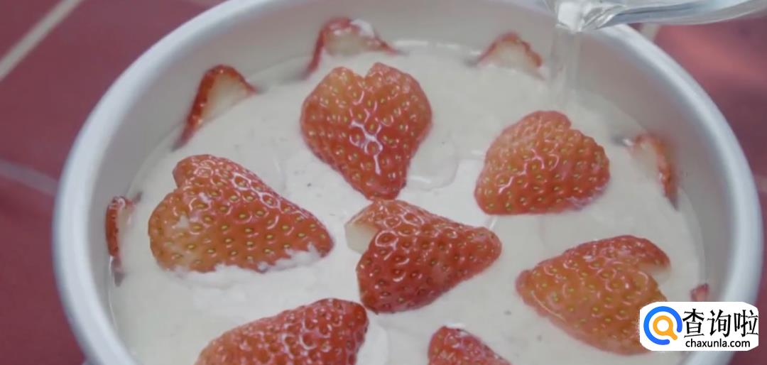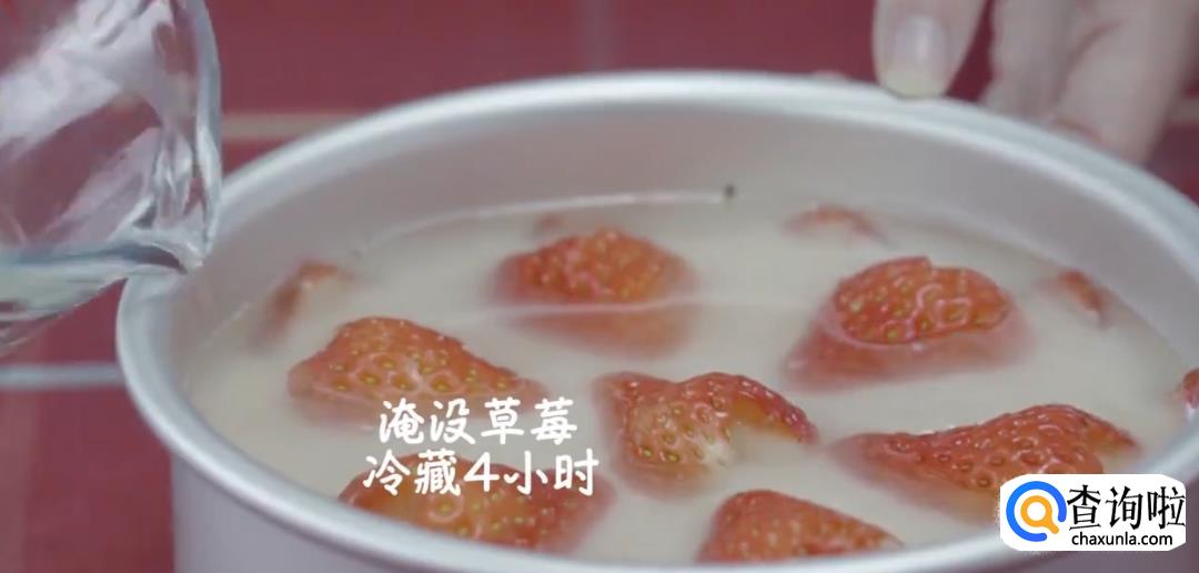 将吉利丁水倒入冷藏好的慕斯表面,淹没草莓即可,然后再冷藏4小时即可。