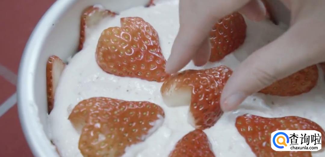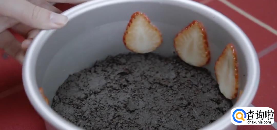 将奥利奥容器的壁上贴上草莓片,倒入草莓慕斯,然后在表面盖上草莓,放入冰箱冷藏。