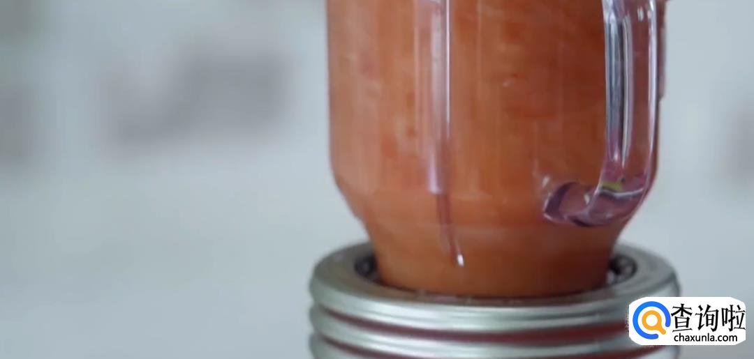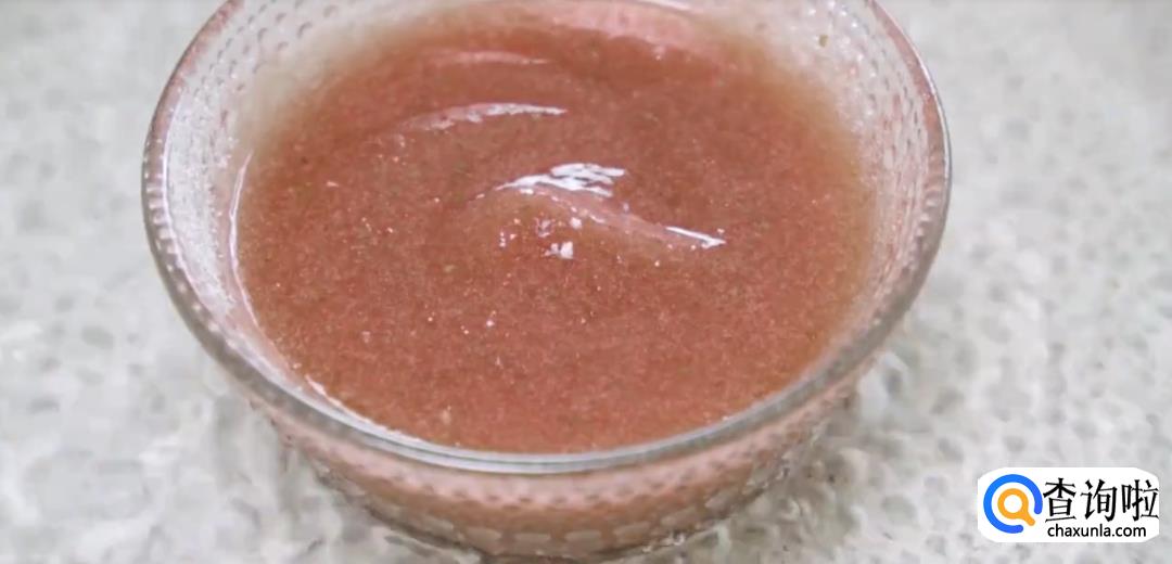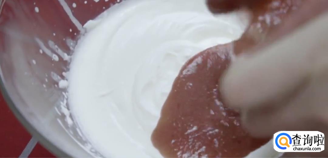 取出冷藏的草莓酱,倒入慕斯糊中搅拌均匀形成草莓慕斯。
