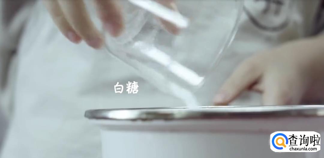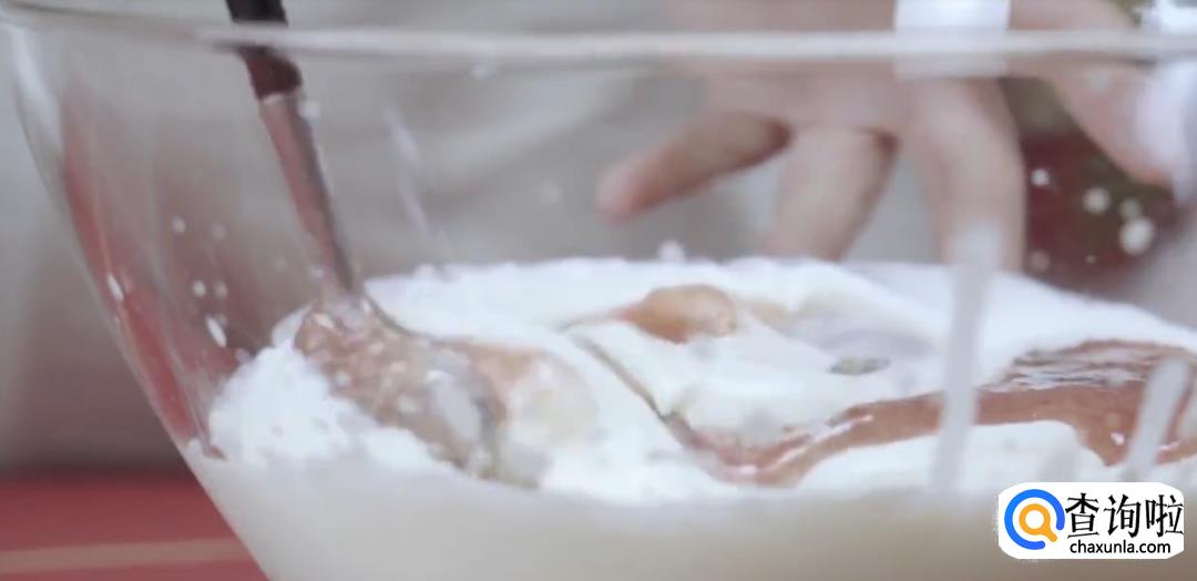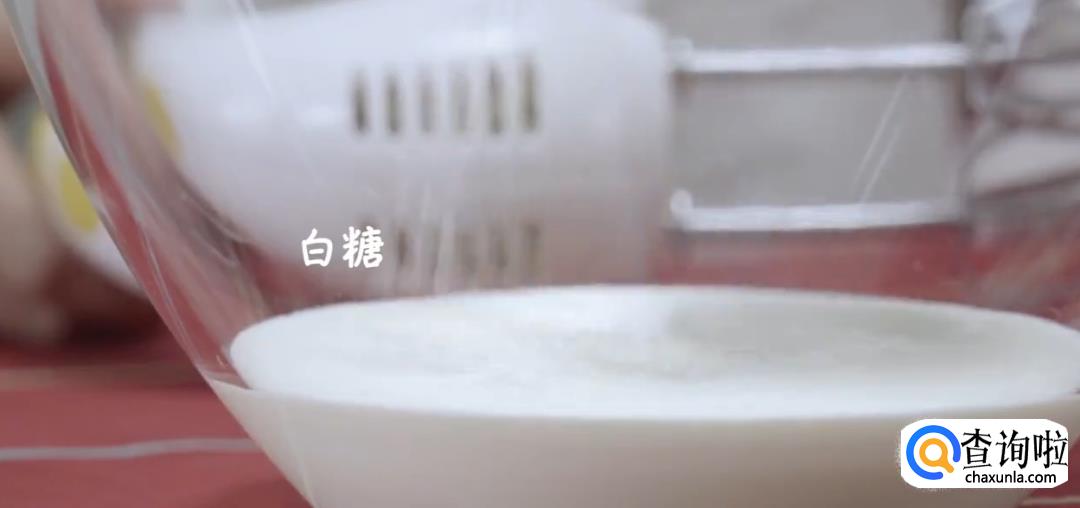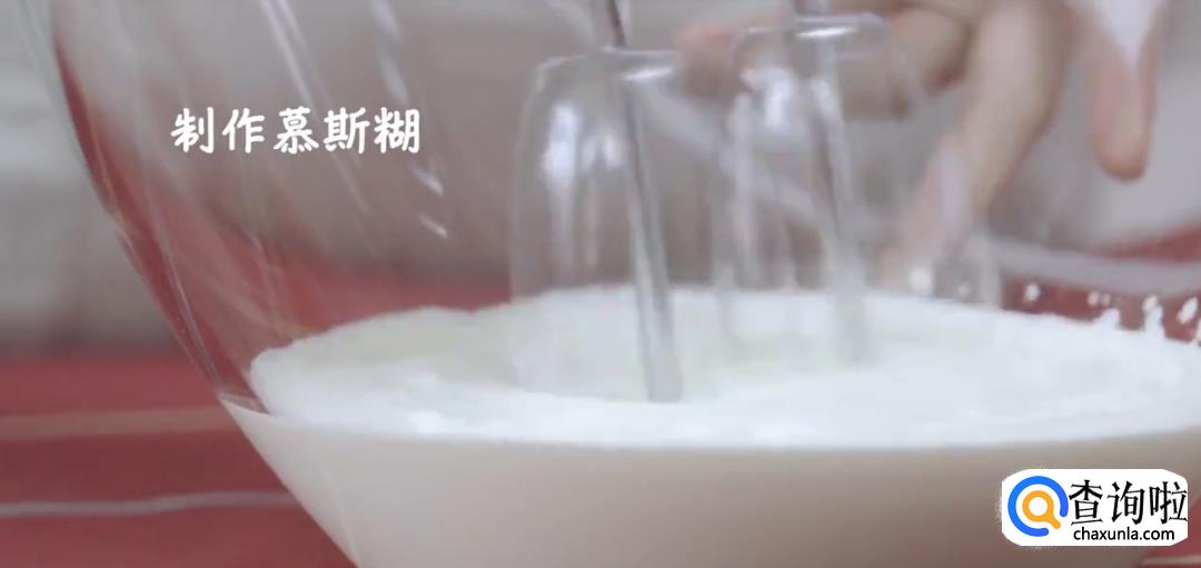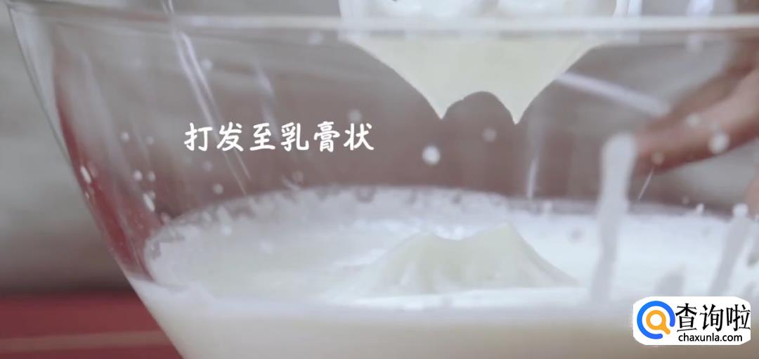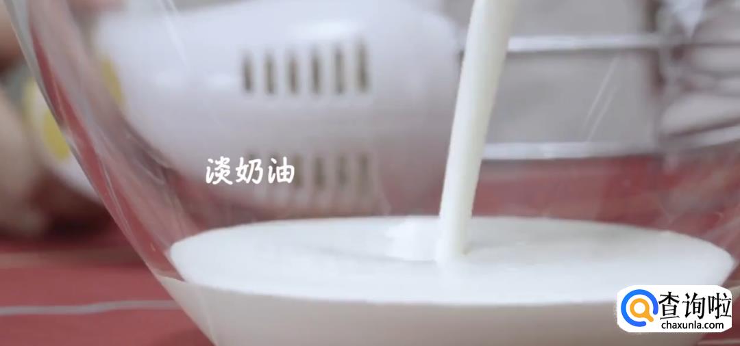 在碗中倒入淡奶油,加入白糖后打发至乳膏状,用于制作慕斯糊。