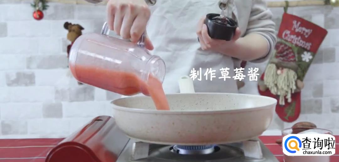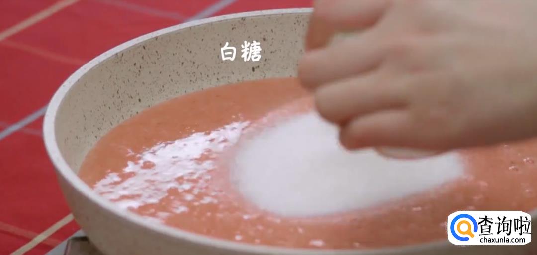 将草莓泥倒入锅内,加入大量白砂糖,开小火不断搅拌成糊状制作成草莓酱。
