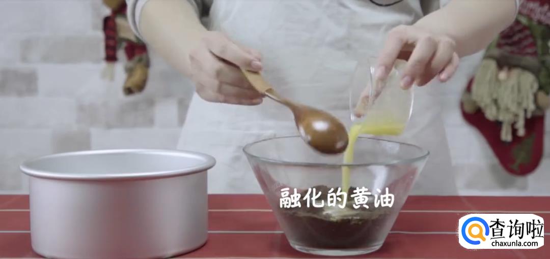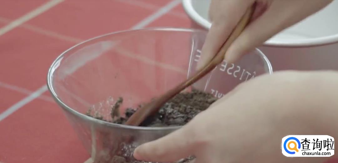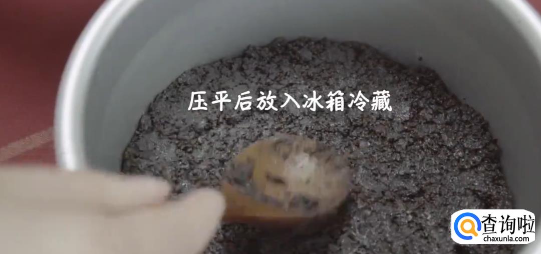 将融化的黄油倒入奥利奥碎,然后搅拌均匀,压平后放入冰箱冷藏。