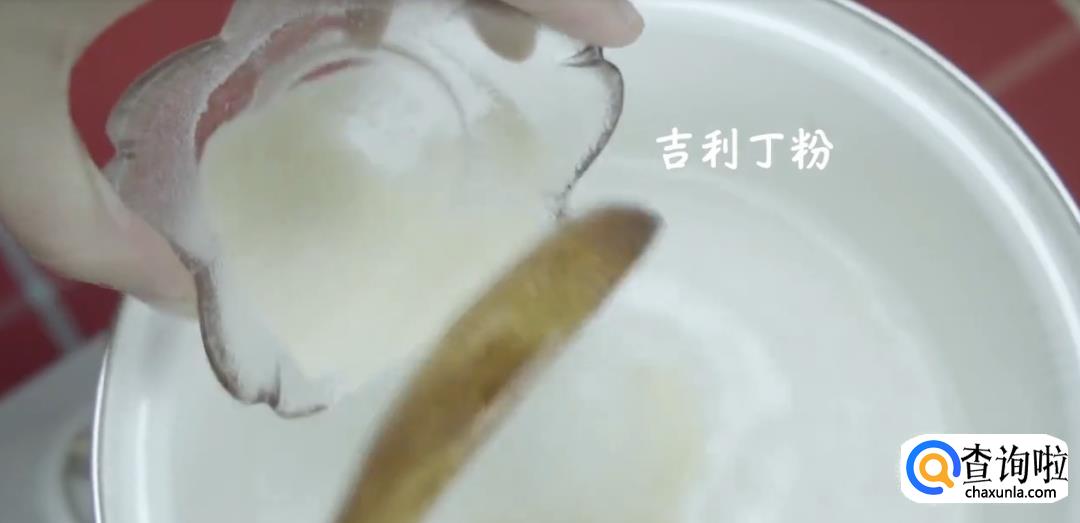 将清水倒入锅中,倒入白糖,吉利丁粉,不断搅拌。