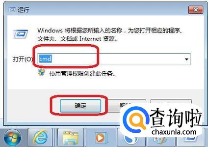 在出现的“运行”选项框中,输入“cmd”,点击“确定”。
