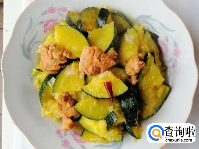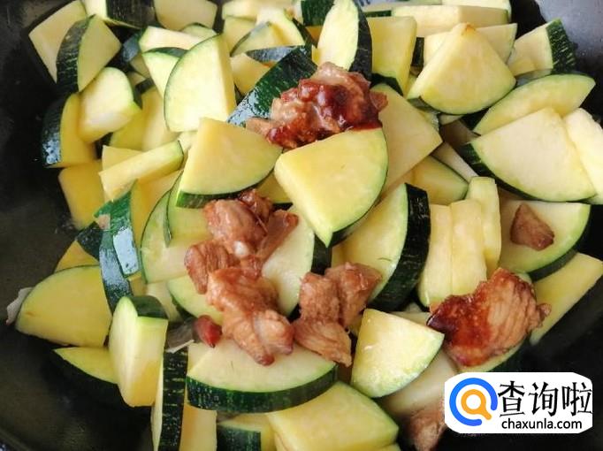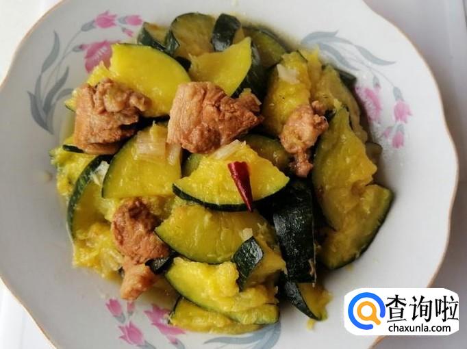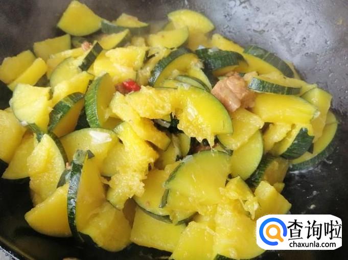 翻炒片刻后加入适量熟猪肉,继续翻炒,也可以加入少量热水,小火慢炖。如图所示南瓜变软后,加入适量生抽和食盐,翻炒均匀就可以了,出锅入盘此菜完成。