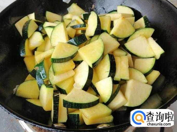 炒锅放油,油热后加入葱、辣椒、姜丝、蒜炝锅,炒出香味后放入切好的南瓜,用铲子快速翻炒均匀。