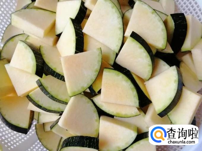 取适量新鲜的南瓜,用清水把南瓜洗净,最好把南瓜用盐水泡一会,用干净的布子多擦洗几遍,然后把南瓜切成下图所示的片状。