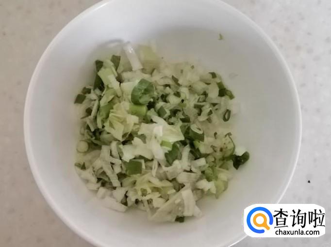 取适量新鲜的大葱,我们可以把葱冲洗干净,如下图所示,用刀把葱切碎,放在碗中待用。
