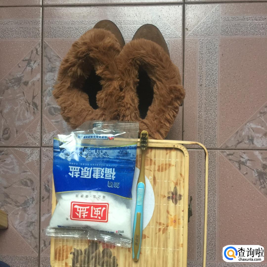 首先准备好要用到的食盐、牙刷和翻毛鞋。
