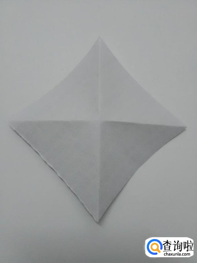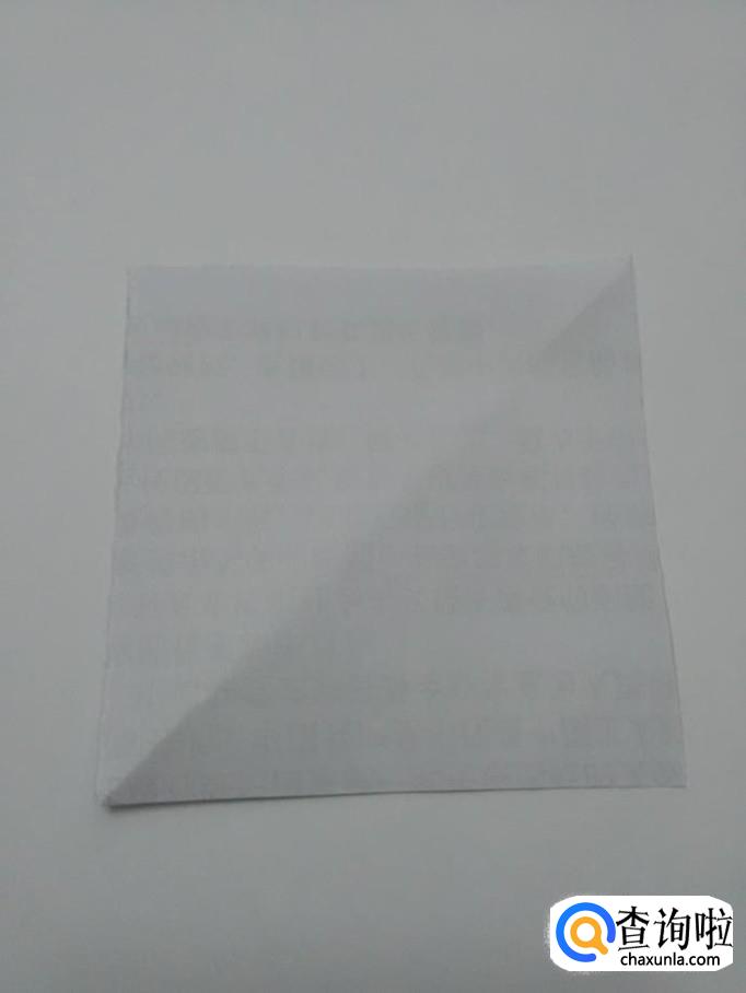 将正方形纸的角往对面折,折出两条对角线,然后把一个角往对面折。
