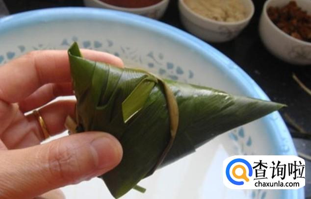 然后把煮好的粽叶折成斗型,然后把泡好的糯米放到粽叶里面,然后把粽子叶折起来包裹一下,然后用绳子固定。